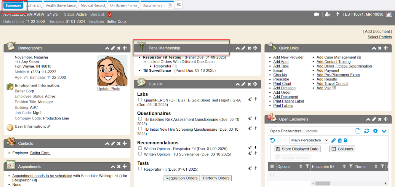 Within the Summary chart tab dashboard, there is a Panel Membership portlet available when working in an individual chart. This portlet allows clinicians visibility of any health surveillance panels that a chart is a member of. The subsequent Due List portlet also relates to panel memberships, as it shows the items (tests & procedures) that are pending as ‘due’ for the chart, including those items related to their health surveillance panel memberships.
