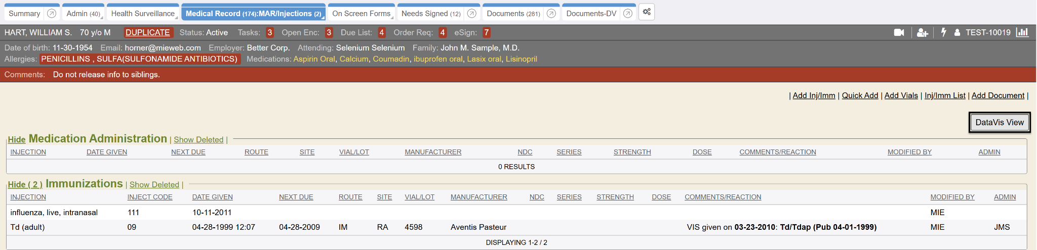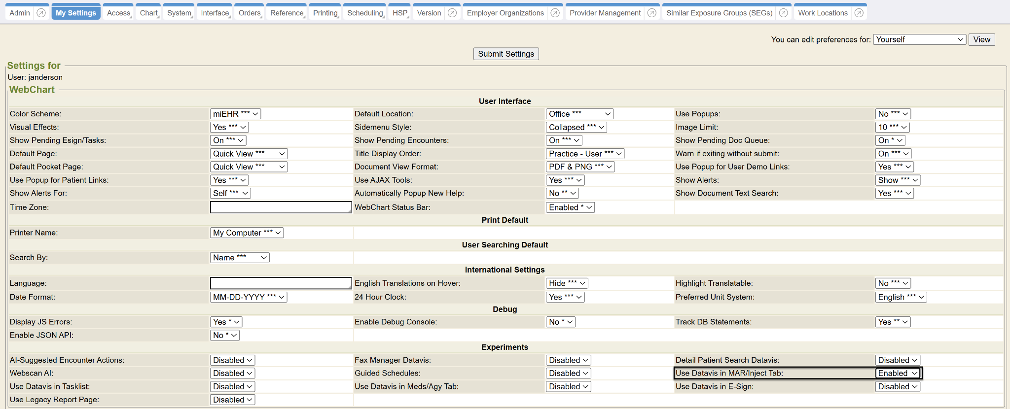 A user preference (My Setting), “Use Datavis in MAR/Inject Tab” is available to clients on 202409 and newer. As clients upgrade, this setting will default to the value of “Disabled”, which will leave users on the current/ legacy view. Users may change their setting to “Enabled” to change the Medication Administration and Immunization list edits to datavis.