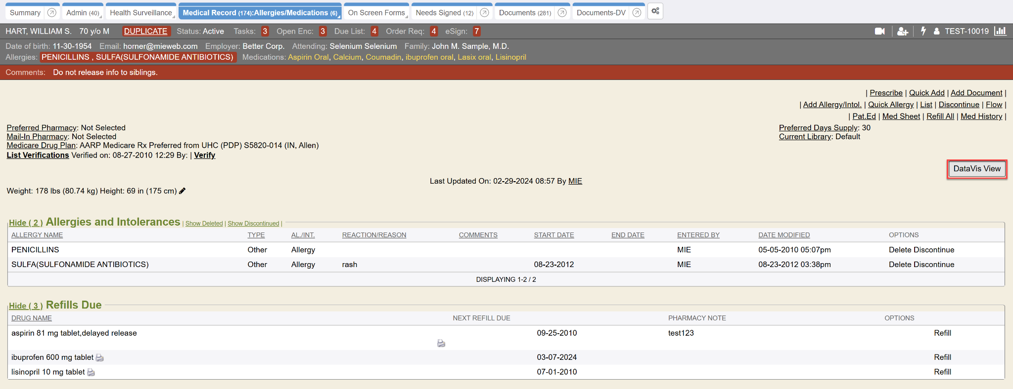 When the Use Datavis in Meds/Allergies Chart Tab setting is set to “Enabled”, the Allergies/Medications Summary is updated to display a DataVis under the Allergies and Intolerance, Refills Due and Medication History sections. If the user would like to switch back to the list view, they can click on the Legacy View button.