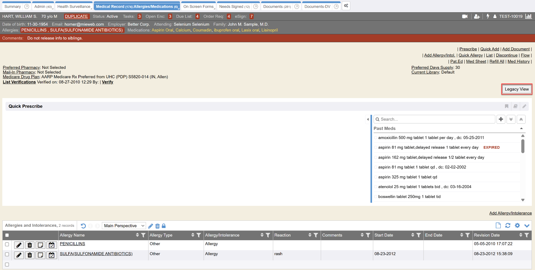 If a patient does have allergies or medications entered into the Meds tab, it will list the allergies, refills due (if any) and medication history on this screen (instead of showing the previous).
