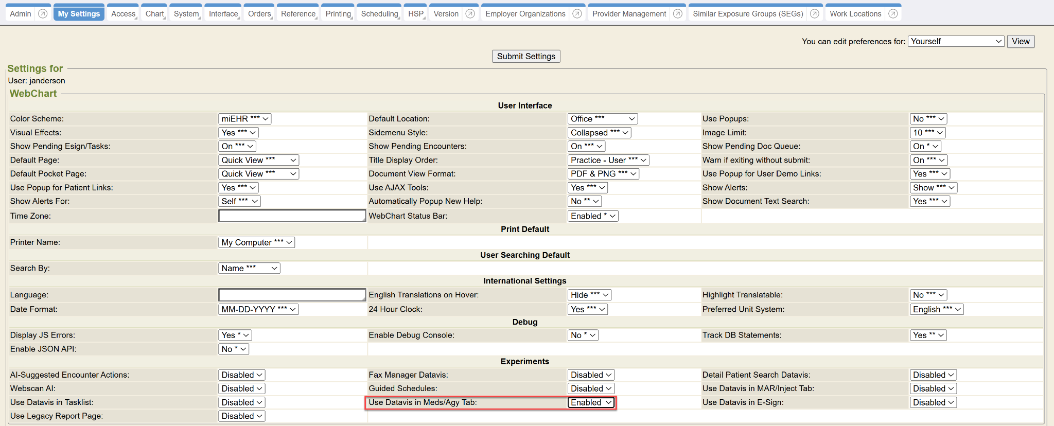 A new My Settings user preference, Use Datavis in Meds/Allergies Chart Tab**,** is available in the 202409 release. This setting allows the user to change from the legacy Meds/Allergies chart tab view/lists to the new view, which is in a new datavis format.