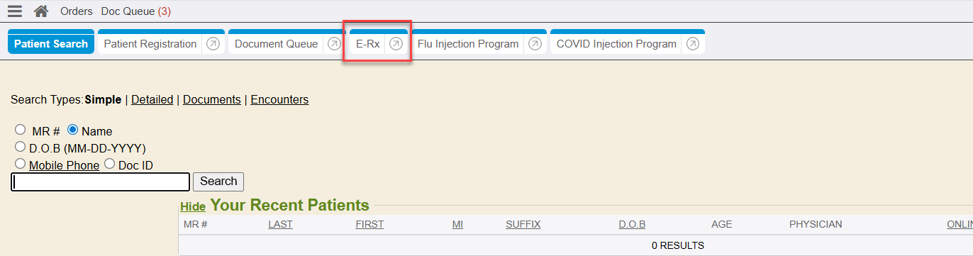 If you are a certified e-prescriber, you will notice any incoming e-refill requests in the top of your screen view. It will show the E-Rx alert at the top, along with the number of e-refill requests to you. These are your personal incoming e-refill requests specific to you, the specific logged in user/certified e-prescriber. These are your pending refill requests to work on.