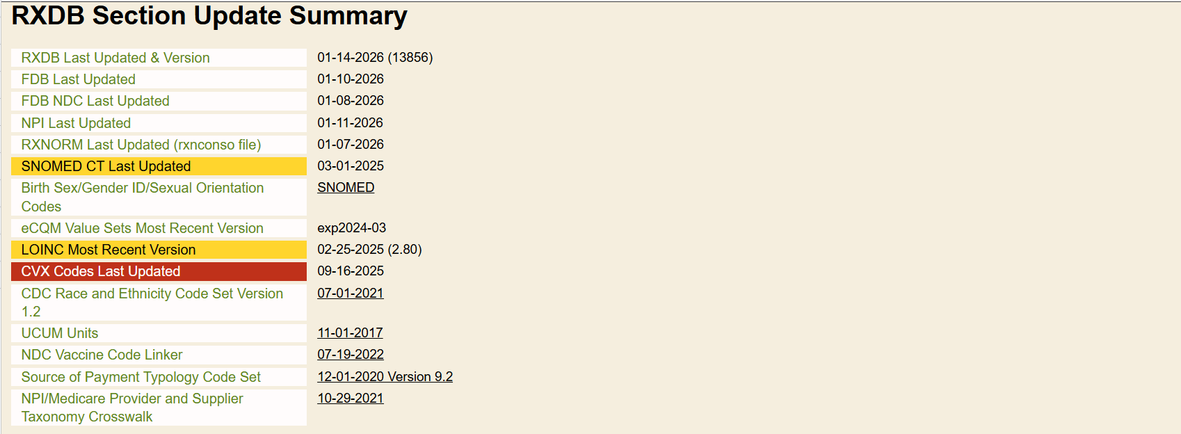 When the RXDB section update summary screen opens, it displays a list of data sets on our servers that are utilized, along with dates of last updates.