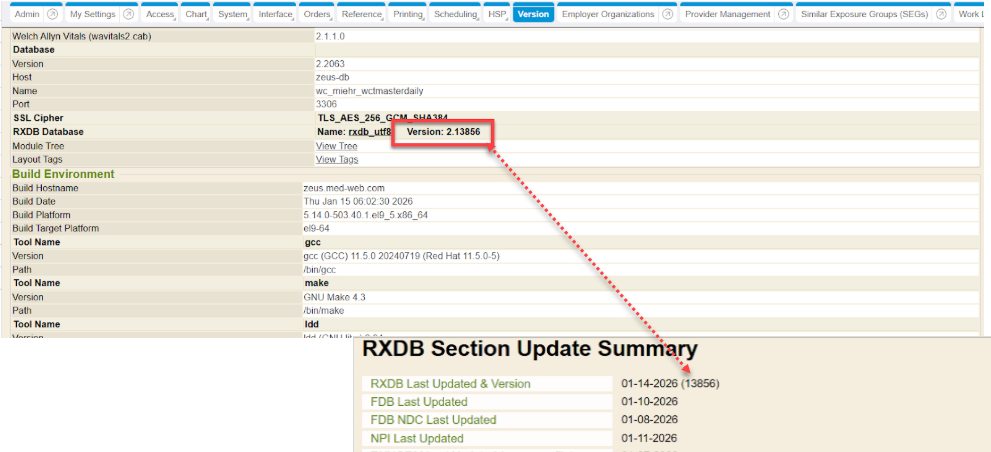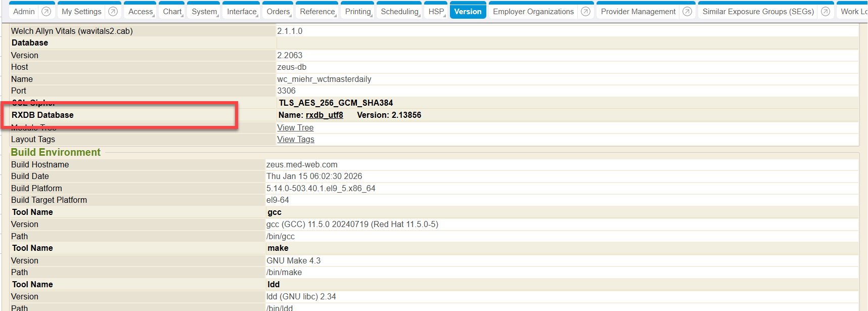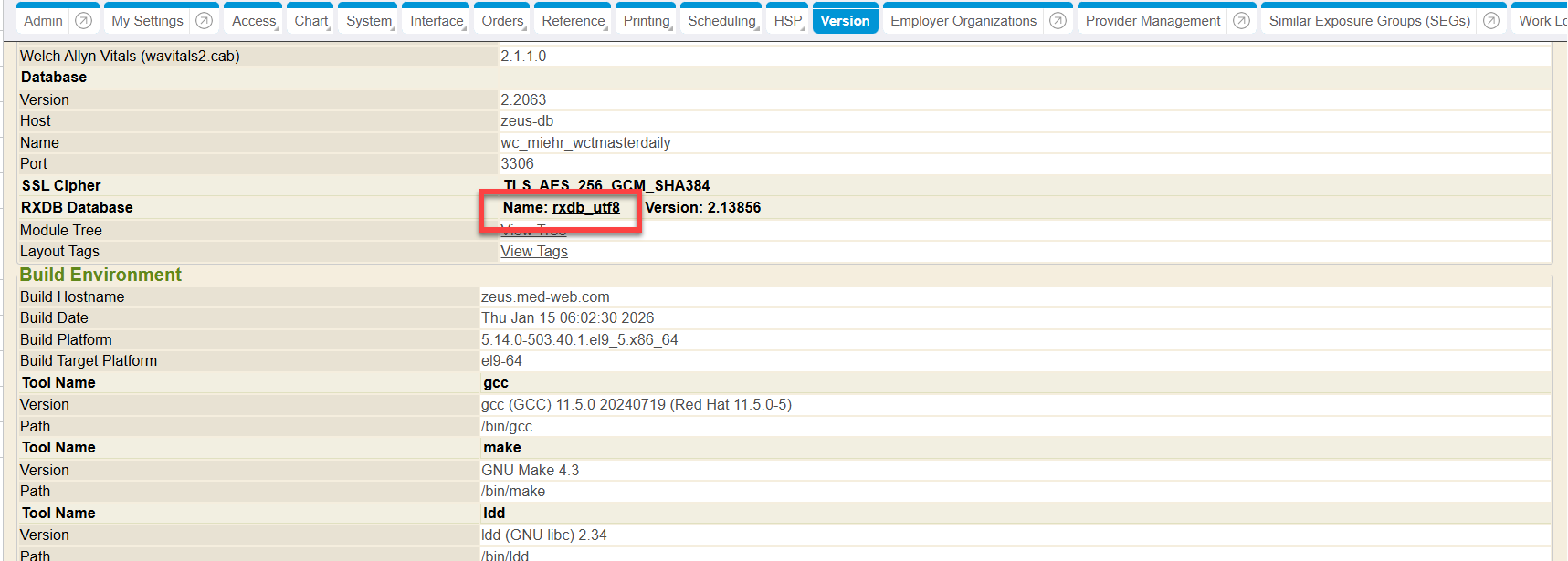 - Version: This shows the version number of the RXDB database being used in the system. This version number is also visible in the rxdb_utf8 hyperlink details screen for RXDB Last Updated & Version.