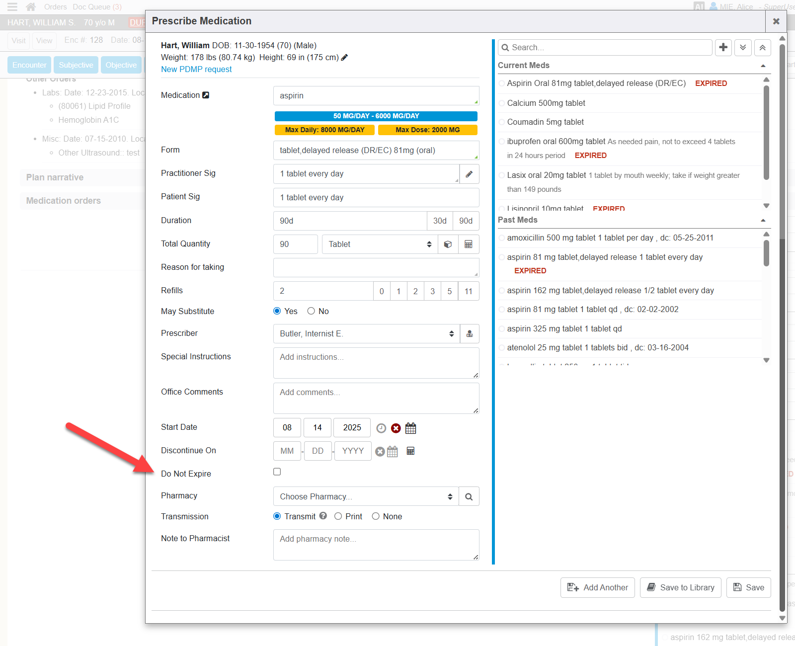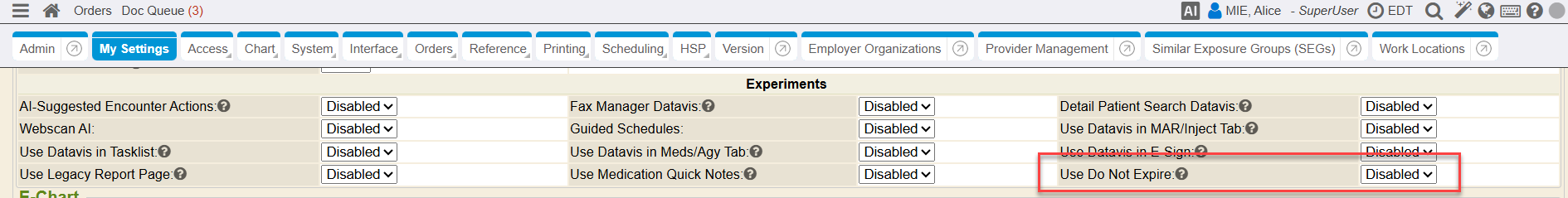 Available in RC202409 and newer, providers can now mark the medication as “Do Not Expire” in order to prevent the medication refill from expiring. The “Use Do Not Expire” feature is available in the My Settings Experiments section and is disabled by default. Users interested in utilizing this feature may enable this feature if desired.