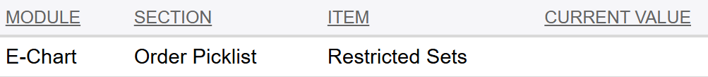 The system setting E-Chart, Order Picklists, Restrict Sets can be enabled to restrict order picklists from being viewed and used by department. By default restricting sets is disabled. If enabled, this system setting indicates (by setting the value) which order picklists to restrict in the system. For a picklist to be accessed by specific departments but restricted from others, from Access Control make a department named the specific order picklist exactly (followed by any other words) and tag users to that department to be able to see/use the restricted picklist. The picklist is then restricted to all other users that aren’t part of that department that matches the picklist name.