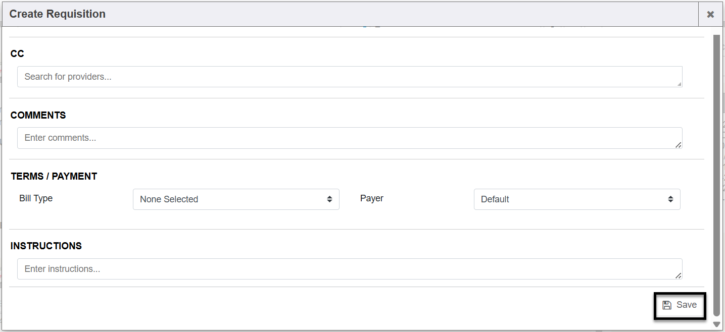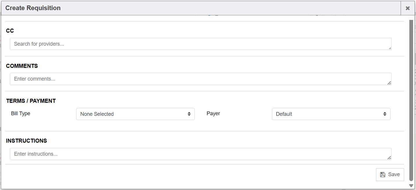Bill Type: Order requests can specify a bill type. If system setting Require Bill Type is enabled, this field will appear. There are four options: The default is None (unspecified), Self, Client, and Third Party. The system setting (Orders, Settings, Require Bill Type) will control whether this field is required or not on the order. If this setting is on (value set to 1), and ‘None’ is chosen in the bill type dropdown, the user will be asked to choose a different option.