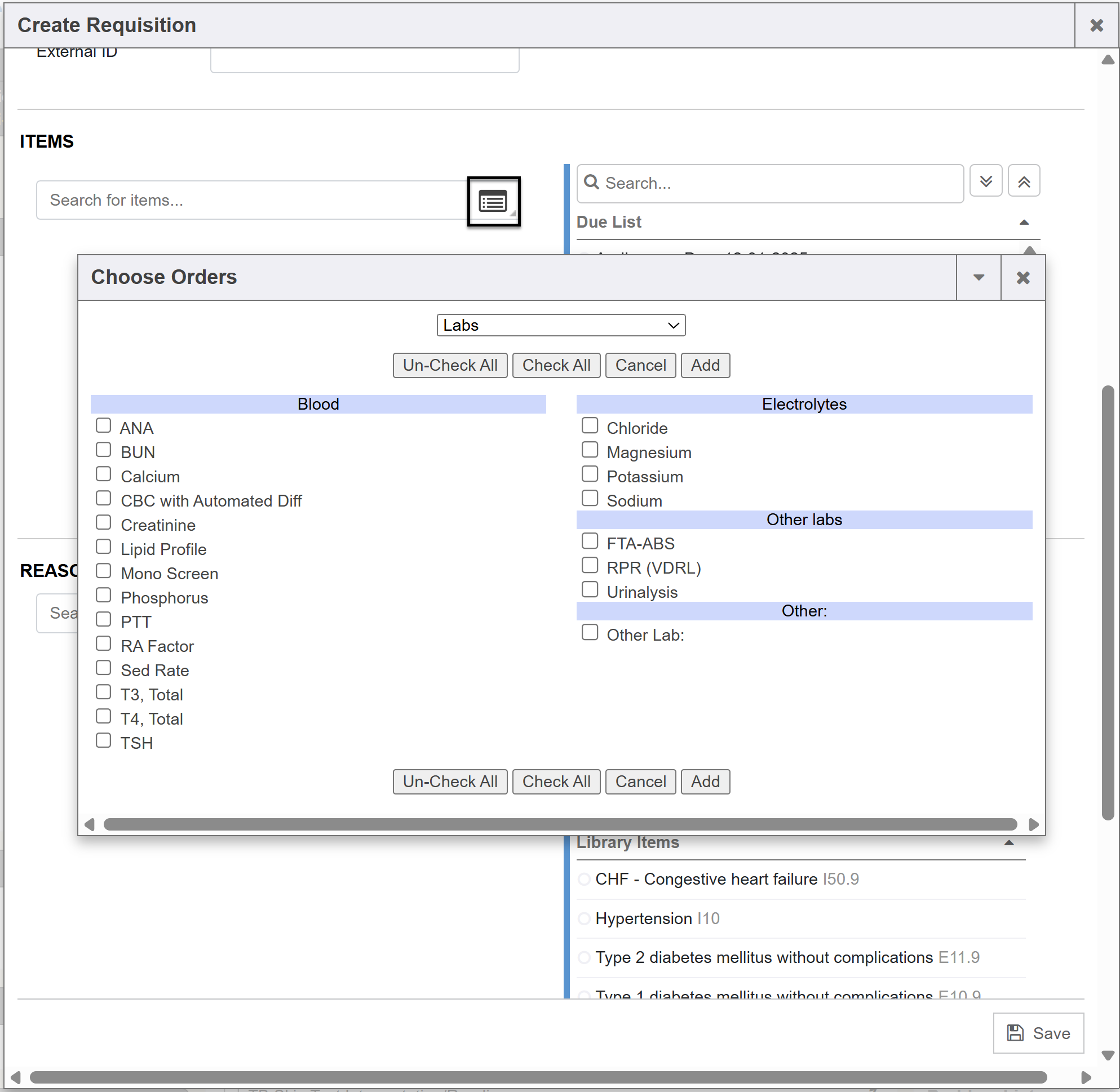 - Items: This section includes a list of outstanding Due List order items for easy access to add to the order ensure no orders are missed. Picklists or the autocomplete can be used to select the order items.