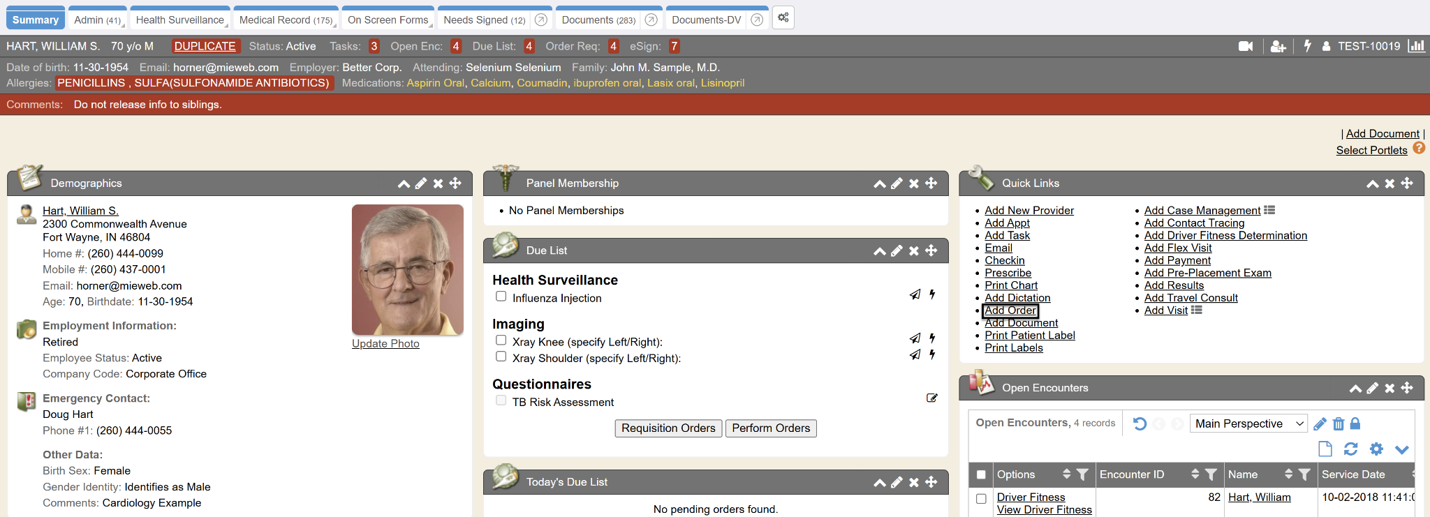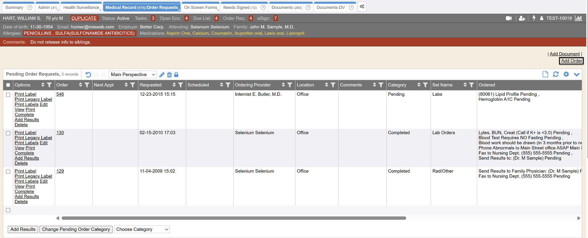 After you are in the orders tab or have clicked the link Add Order from somewhere in Enterprise Health , your default action may be set to add order. That means when you have clicked the order tab or the add orders link, then the ADD ORDER screen will appear for this patient. Otherwise, the most recent orders summary will open.
