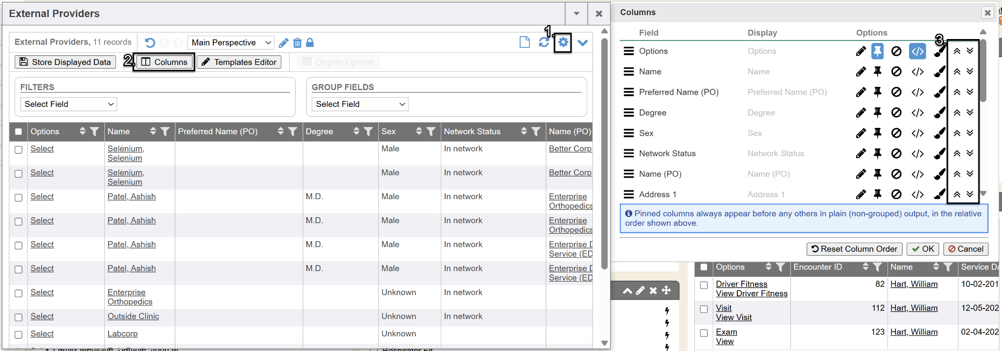 You can also reorder columns in any order you wish. Perhaps body part treated is something always relevant to your selections when referring patients. You may want to reorder that column to be after the ‘name’ column so you can easily visibly look for selections that way. Simply click on the Gear icon, then the Columns button and use the arrows to rearrange the columns. The system will remember your column order preference.