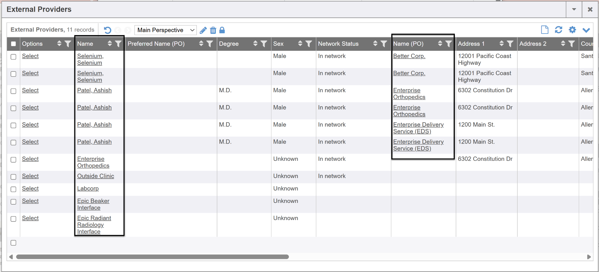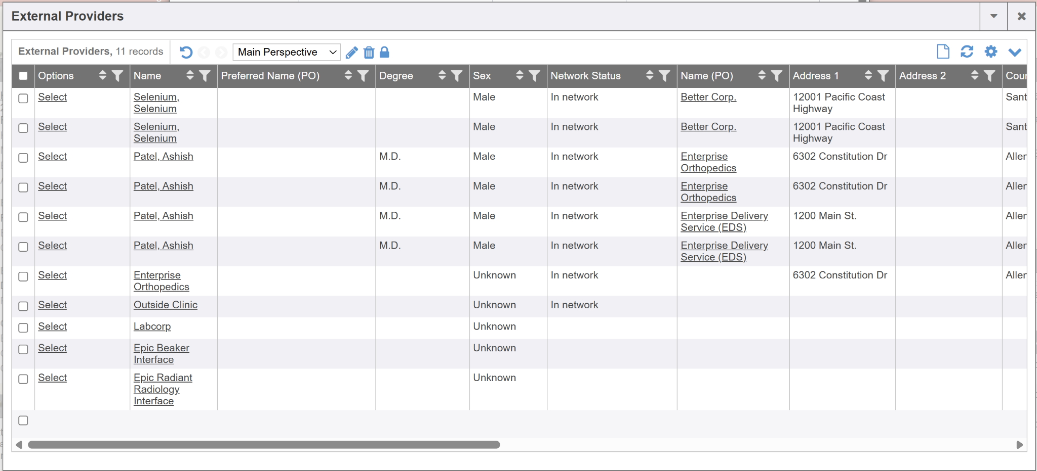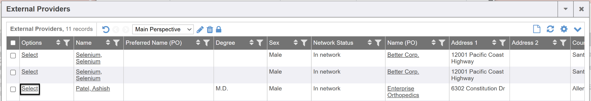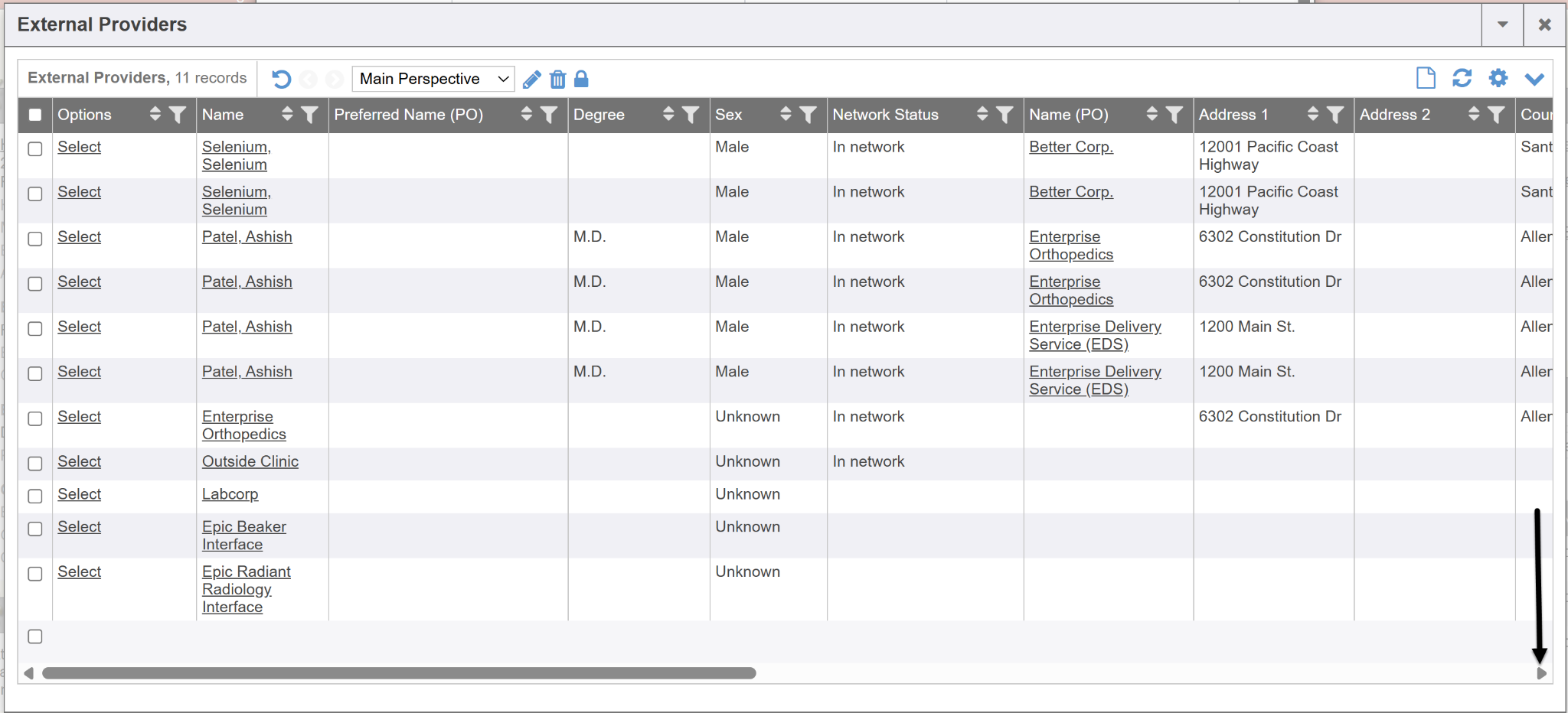 You can utilize the right scroll bar at the bottom of the External Providers screen to see more identifying information regarding the referable provider or organization such as language, office hours, address, body parts they treat etc. This result grid can be a customized layout of specific columns/data you wish to result.