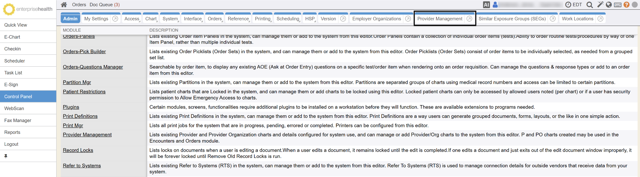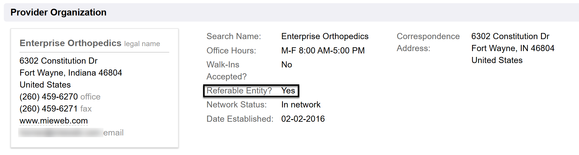 Companies using Enterprise Health may want a method to manage their external providers. System Administrators may compile as a directory of providers commonly referred to or utilized. The directory may contain providers within their own practice and/or contracted providers. Details captured on the provider include location and contact information, languages spoken, specialty and contracted procedures listing. Out of the box credentialing information includes NPI, TIN, License numbers and expiration dates, DEA numbers and expiration dates and a next credentialing due date. Standard reports include detailed lists of providers requiring re-credentialing. The module can be custom configured to capture other specific details practices may wish to track, as well as any custom reporting on those fields.
