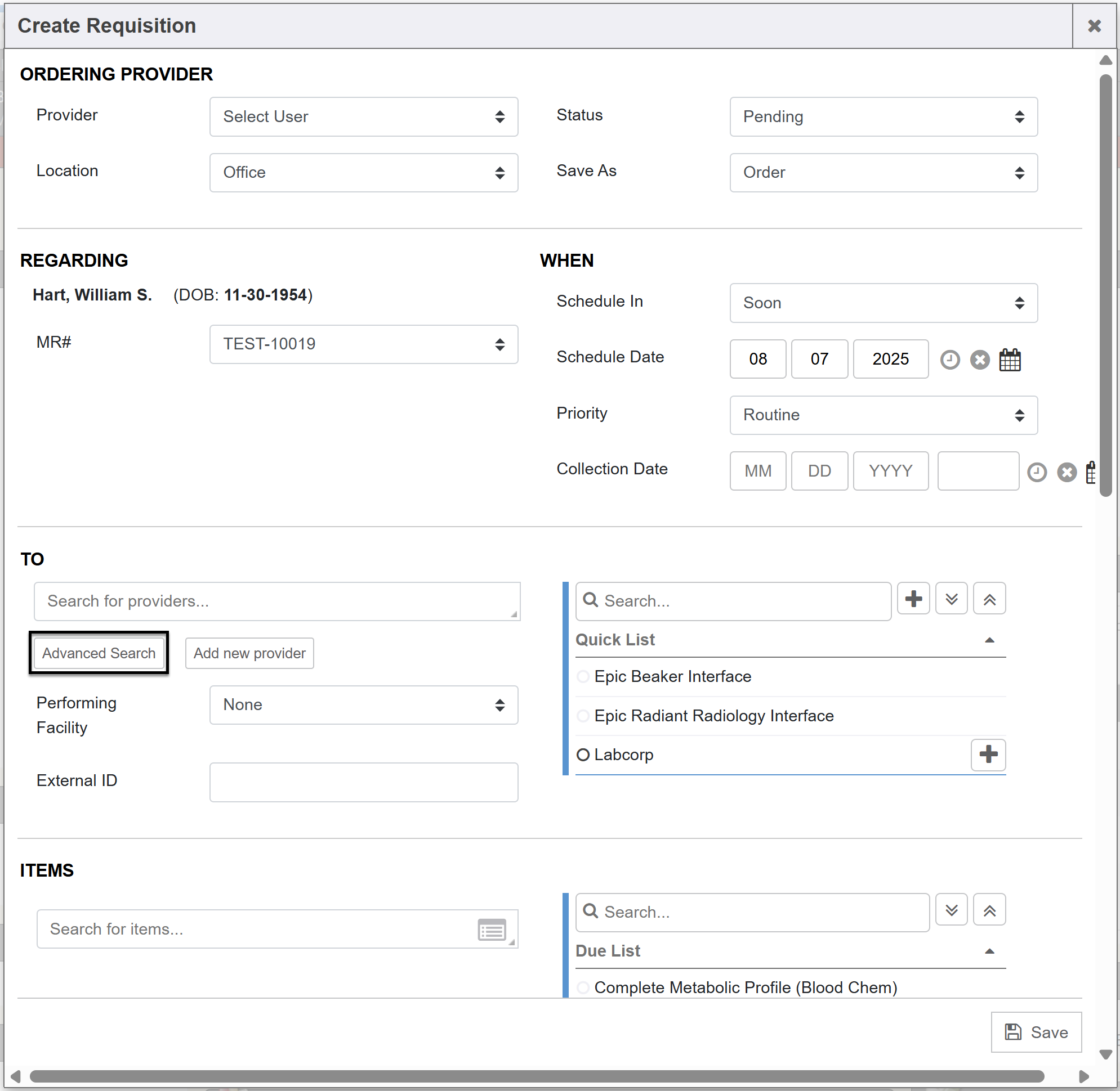 While creating an e-order for the patient (either via the add order module or within a visit encounter), you will see the Advanced Search link next to the Refer To auto-complete field.