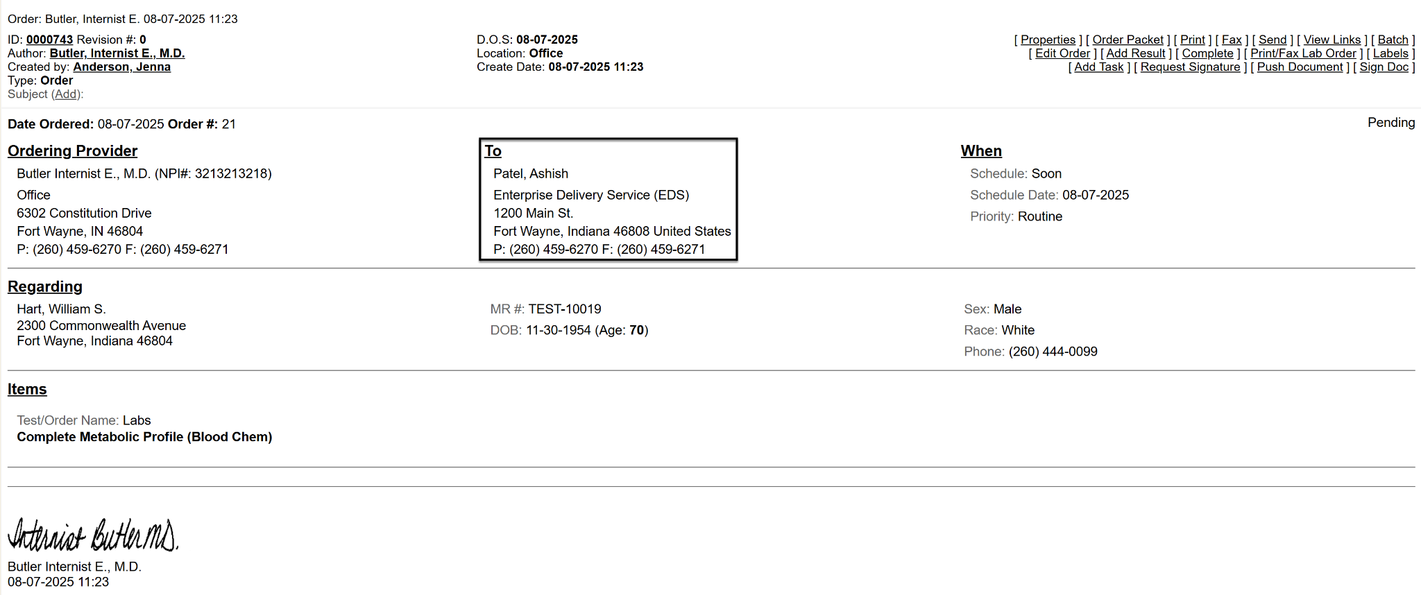 When the order(s) have been requested, you will be taken to the order document view. You will see the referable entities details that have been housed using the Provider Management module.