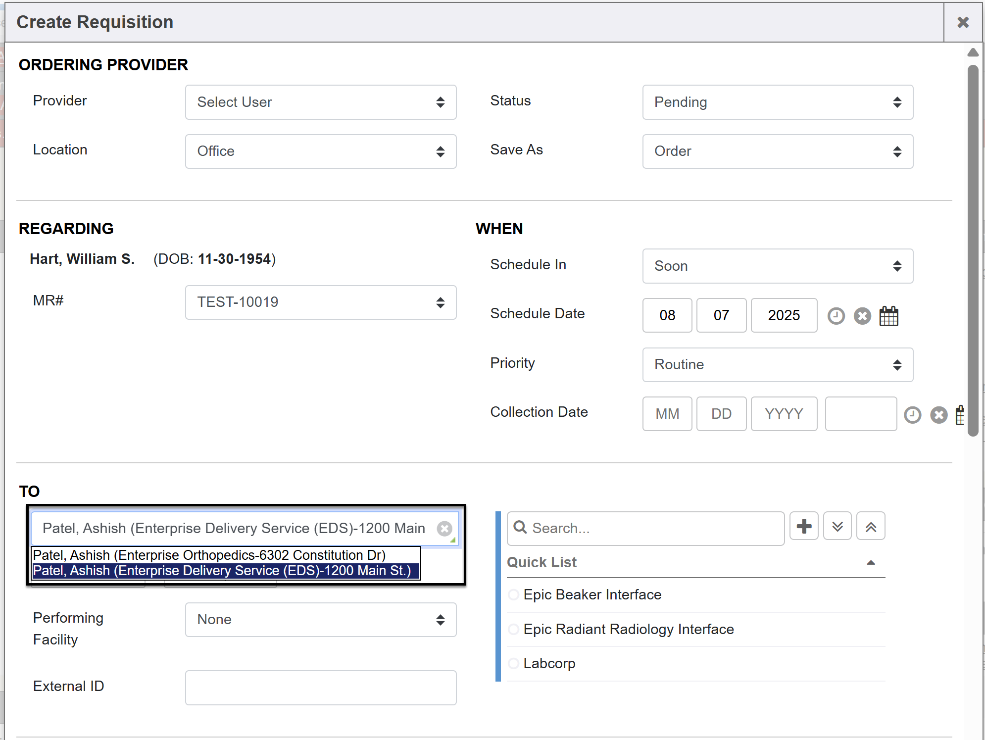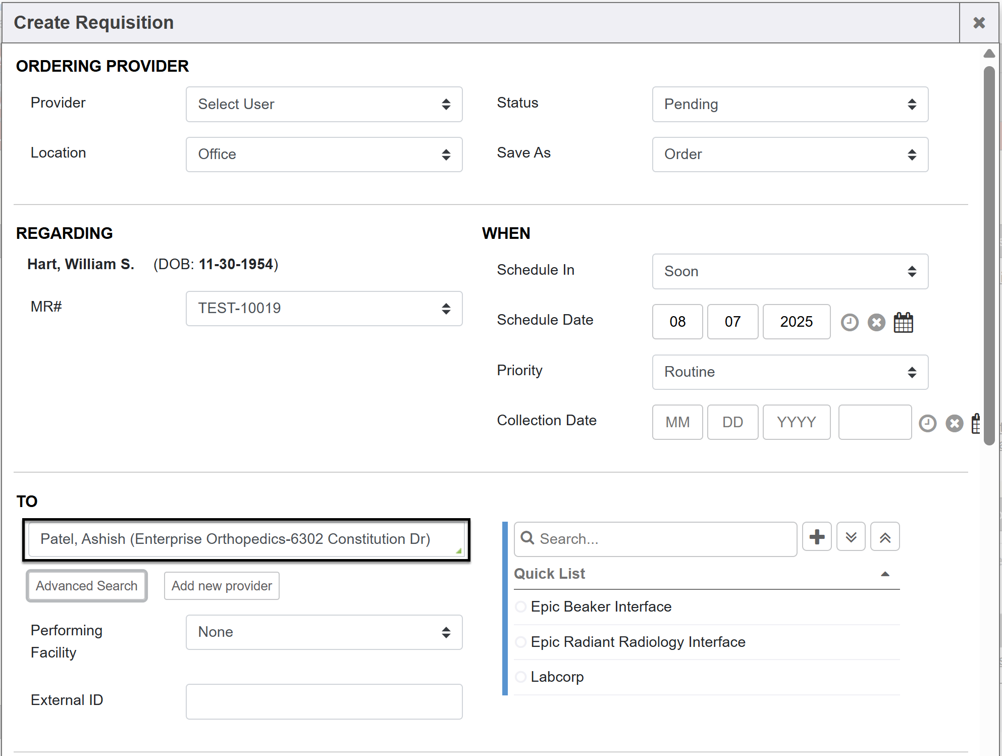 You can utilize the auto-complete for the Refer To field if you already have memorized referable providers or entities that you commonly refer to and know they are referable entities. You don’t always have to click the Advanced Search to be able to select referable entities. When the Advance Search functionality is enabled, this auto-complete in the Refer To field behaves the same way. It will result in choices (based on what you type in the auto-complete) of only referable entities or providers from the Provider Management module based on chart types specified in the system setting “Chart Types”. Note: If you do not see addresses next to the provider or organization in the auto-complete choices, contact your MIE Implementer. They will need to program the attribute to show the organizations and addresses a provider is linked to when using the auto-complete. This will help users select the right one as the order printable/faxable document will display that address info.