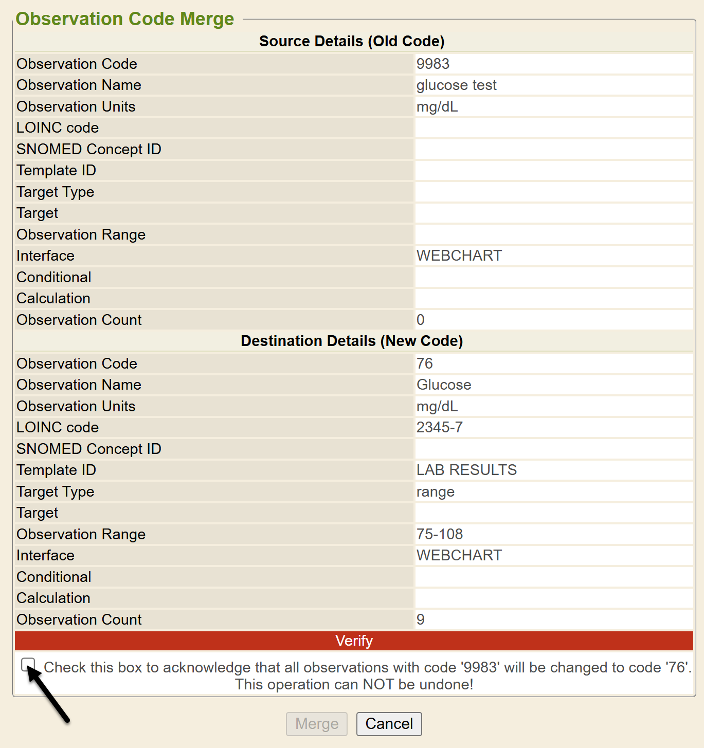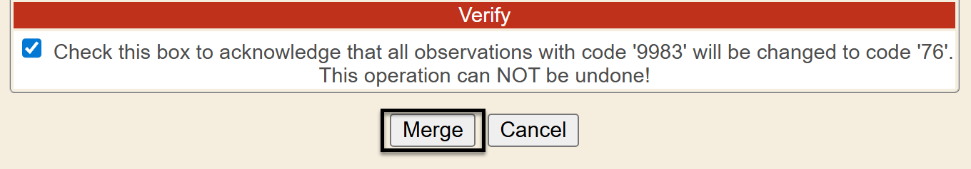 To continue the Observation code merging you must checkmark the Verify box. The Merge button is greyed out until you check-mark the verify section. This is just protection to make sure you wish to proceed with merging. Again, once an observation code is merged, there is no way to unmerge it.