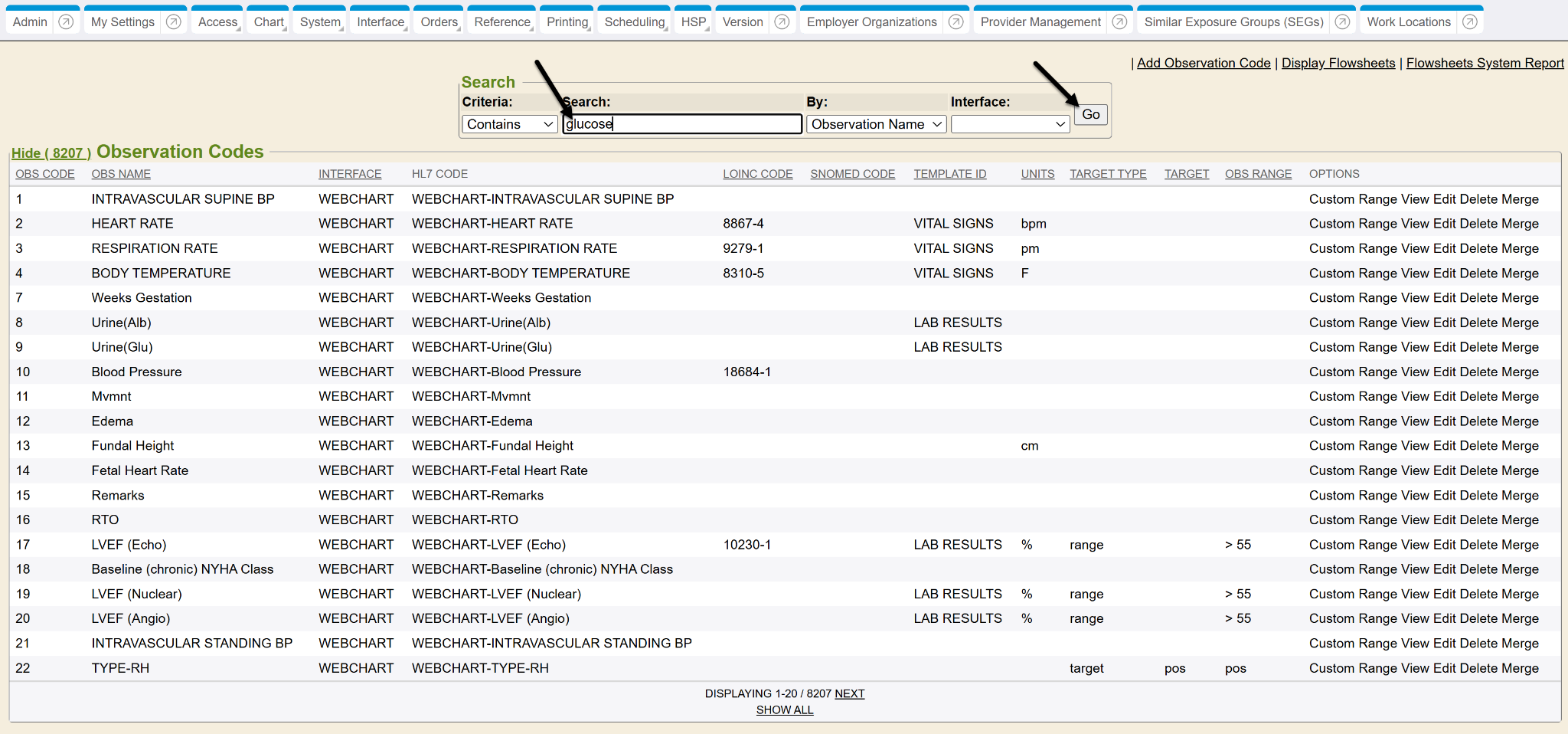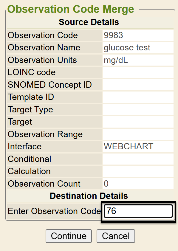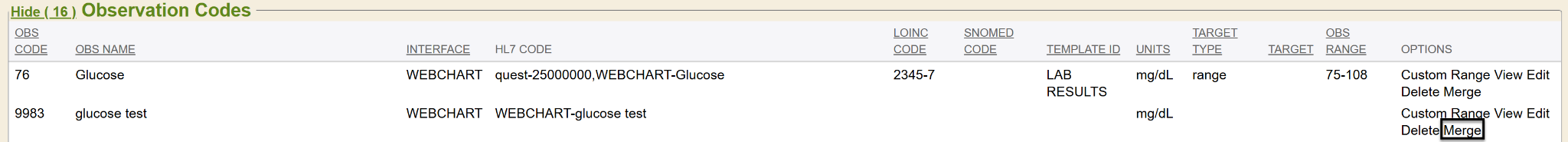 When merging an observation code you will want to merge from the observation code that you want to be removed/overwritten. For example, if you want to merge observation code 9983 glucose test to observation 76 Glucose you will merge from observation 9983 glucose.