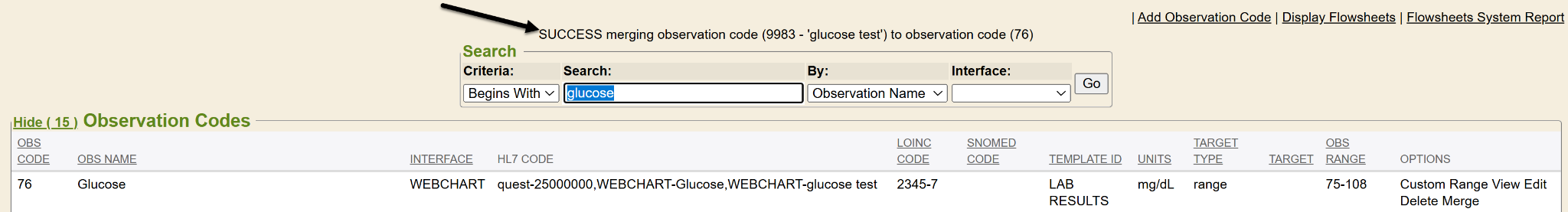 You will receive confirmation of the observation code merging and you will notice that there is now only one Glucose observation.