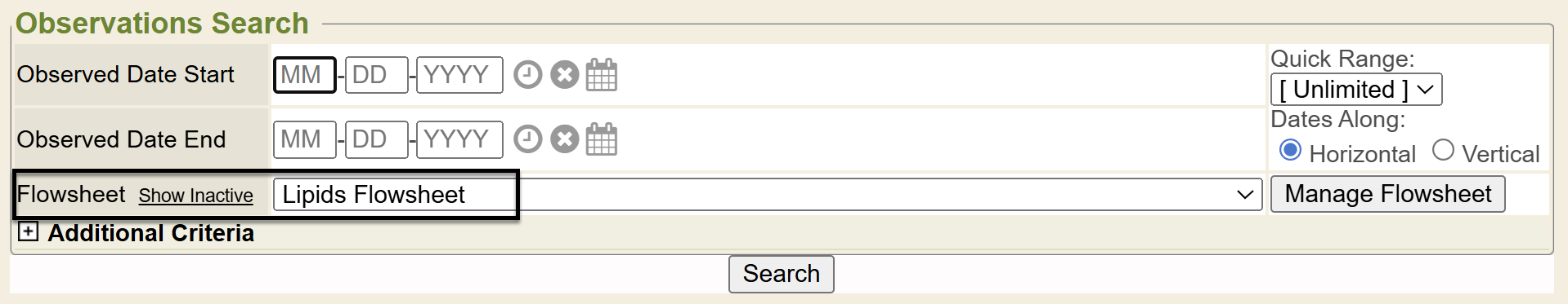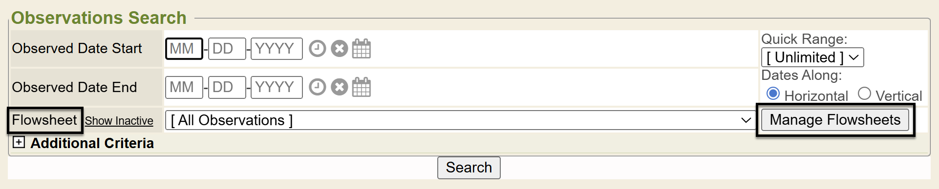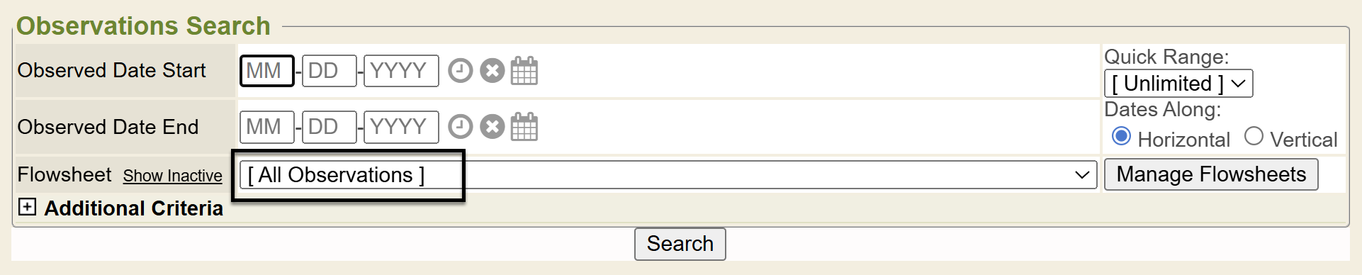 If you selected a specific flowsheet to render, under the resulting flowsheet and under the message additional observations exists, etc will be the specific observation entry fields specific to this flowsheet you rendered. If you do not select specific criteria, like a flowsheet, the system may tell the user there are additional observations that exist, modify your search to view. That means this patient has other observations stored in their chart which don’t fit the search criteria specified. If you want to view those, simply modify your search criteria.