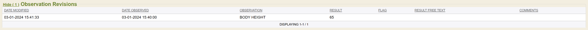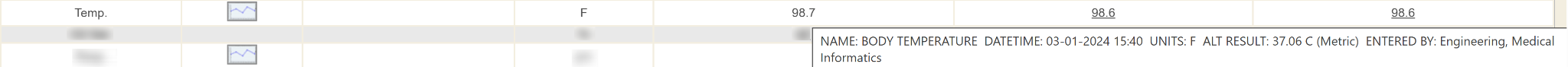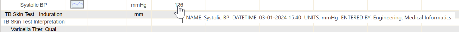 If you hover your computer mouse (don’t click the mouse) over a specific observation’s underlined result then it will display a short summary of the observation result. It shows in a summary box the name, date/time and units. This is helpful if your date range causes the screen view to be very wide and you have to scroll over to the right, then you lose view of the first columns that specify name & ranges, etc.