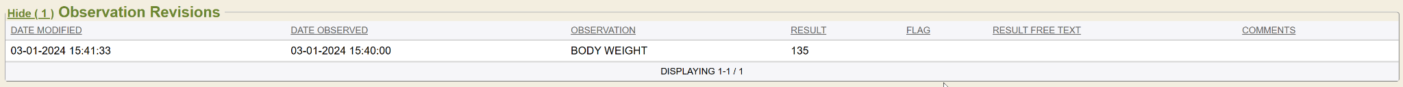 To view the entire listing of observations for the patient, simply leave the date ranges both blank, set the Flowsheet to All Observations and click search. The system will render all the observations stored for this patient.