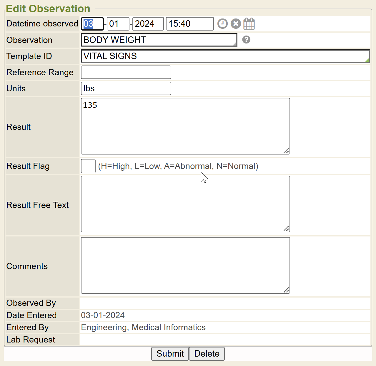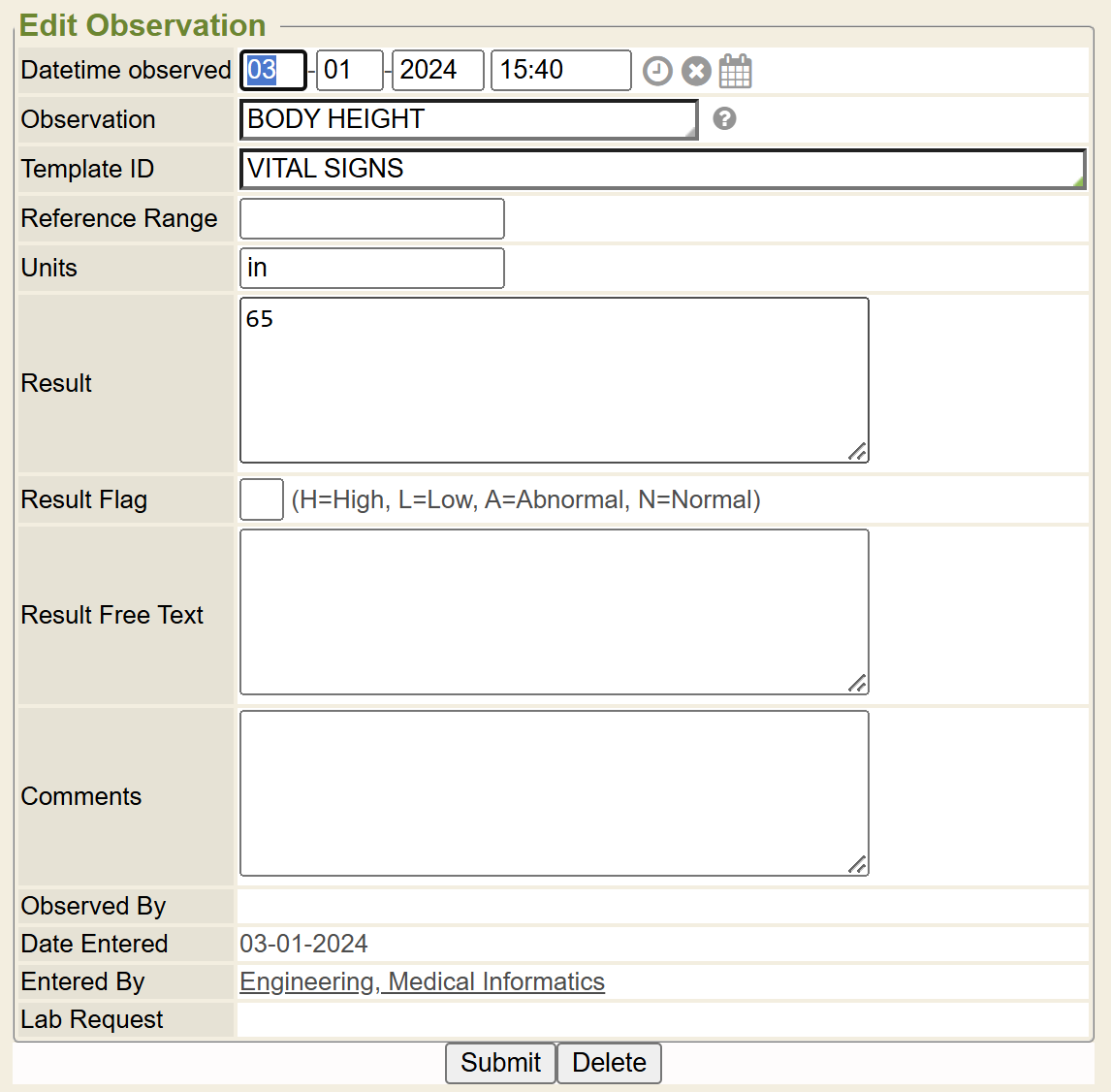 - Result Free Text: Type any notes related to the observation’s result. This does not show in the list or tests view. It only shows here when a specific observation is opened to view or edit or delete. This is also used for large report-style results that come in from interfaces for particular tests.