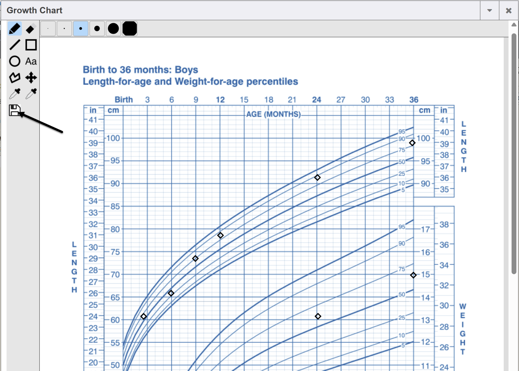 These are for pediatric growth charts and also for OB purposes. They have curves that show where the different percentiles are. To save the chart, click the Save icon and it will be added to the documents in the patient chart.