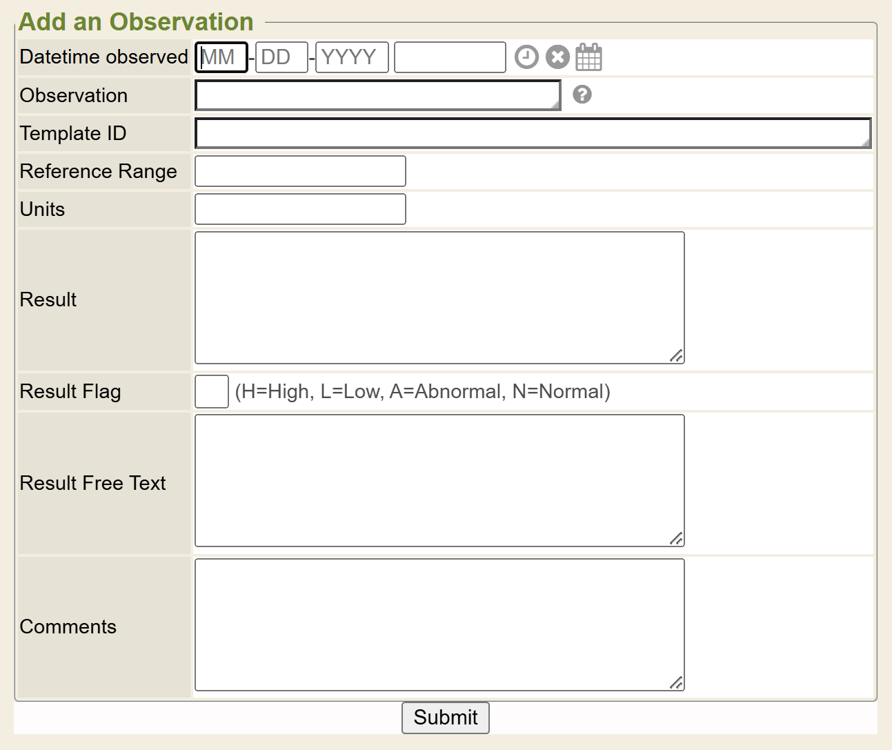 These are fields that you manually enter data into and to add the observation to the patient’s chart.
