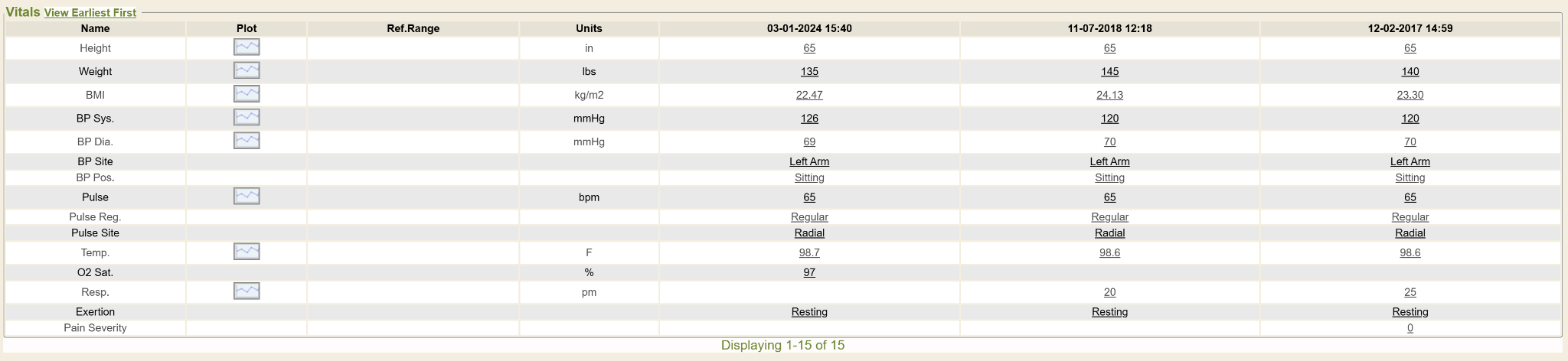 The last line of the results box displays the total number of observations listed in the summary. In this case above, the patient’s search result shows 15 observations that fit the criteria entered.