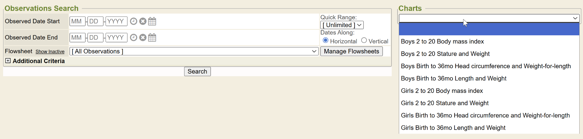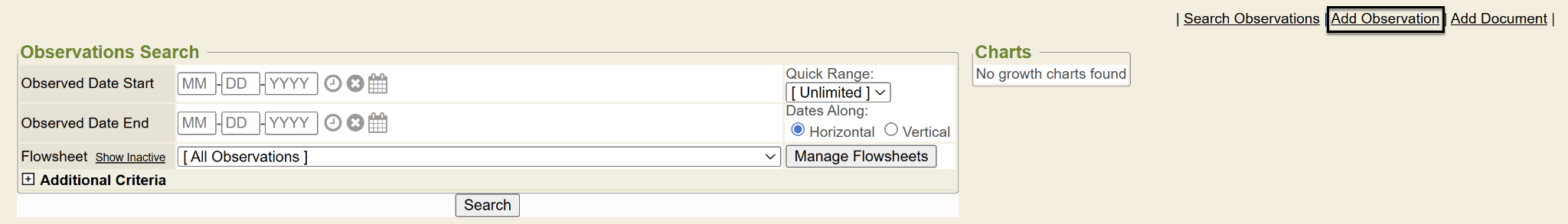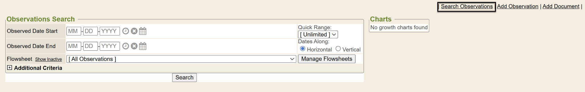 Once in the Observations/Flowsheets chart tab, users will see the Observations Search tool.