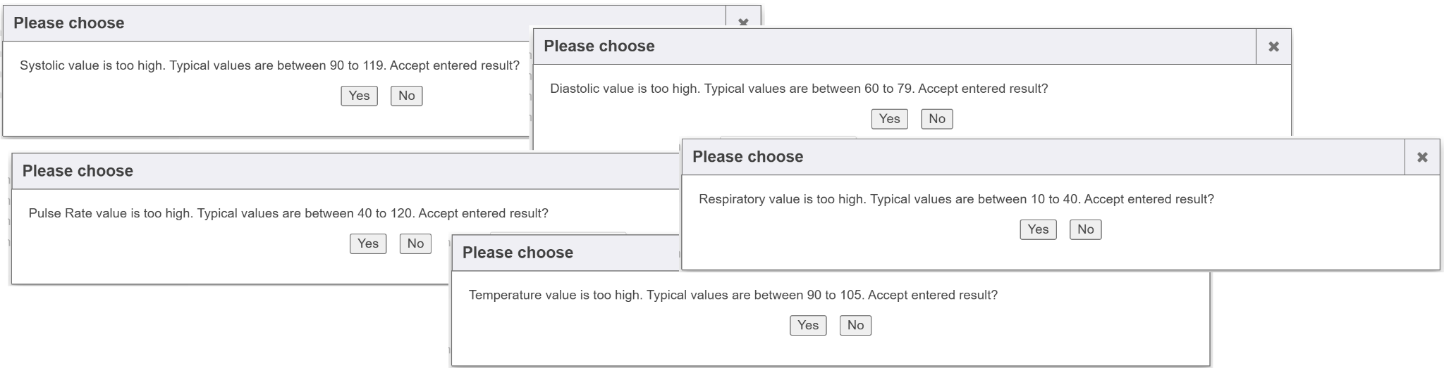 When entering measurements, any blood pressure, respiratory, pulse, or temperature values falling out of range will produce an on-screen alert, giving the choice to modify.