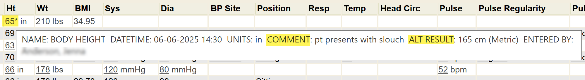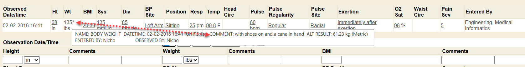 But remember, hovering over any recorded vital sign will also display (in the hover details) the alternate converted unit of measurement.