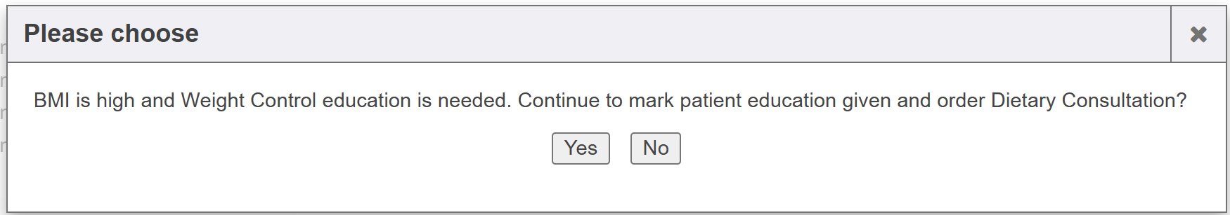 Additionally, if BMI falls outside of a healthy range, the system will automatically prompt a need for patient education and a potential Dietary Consultation. Clicking Yes to the pop-up alert will allow the system to add the Dietary Consultation order to the visit encounter automatically.