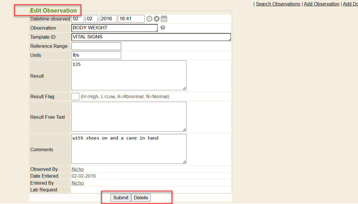 Once you click on a recorded value within the chart, the Edit Observation screen will display. Here you can edit any data on the existing recorded value for the vital sign. Click the Submit button after editing the record. The system will display a message that it has successfully updated the observation.