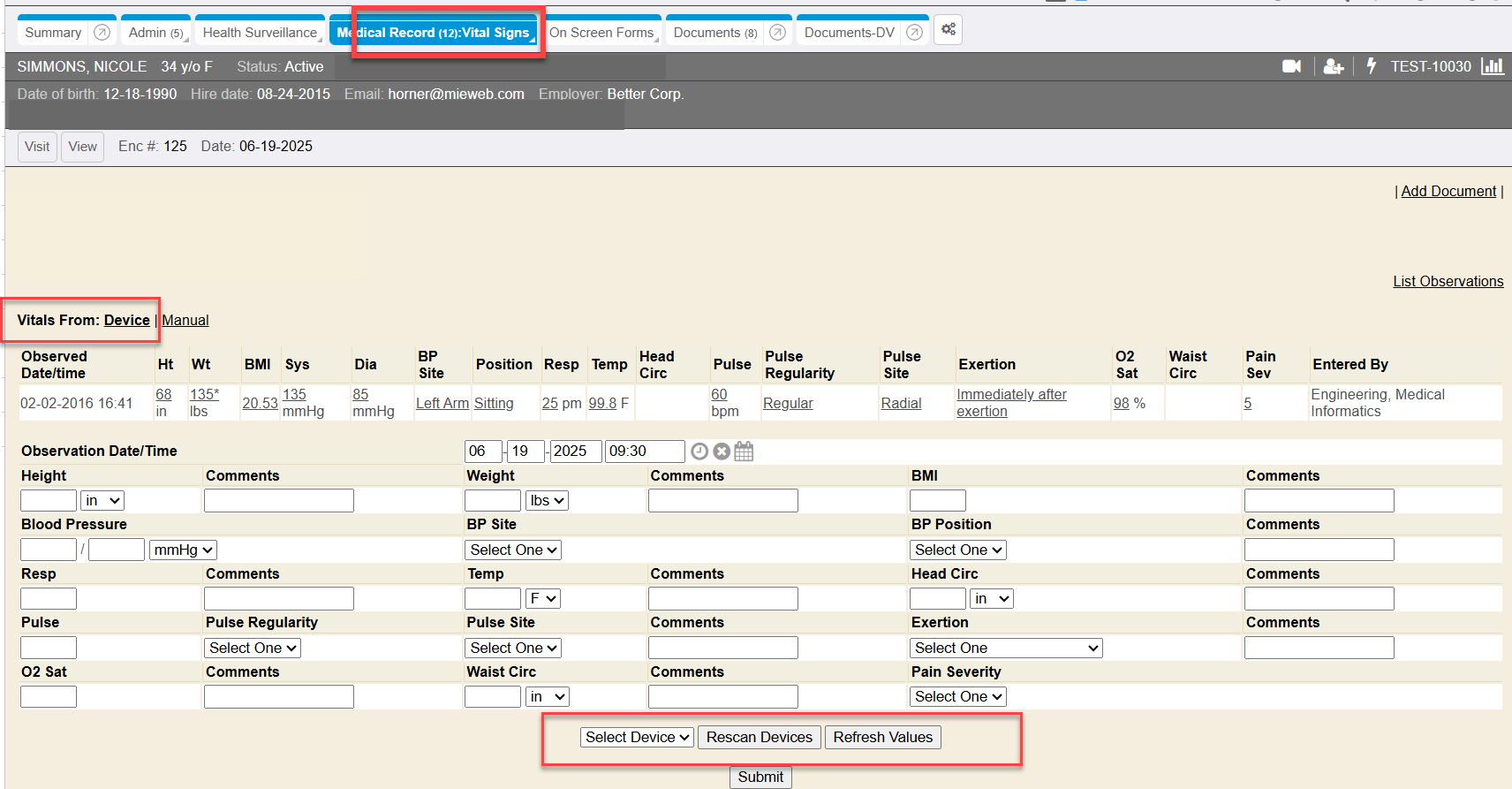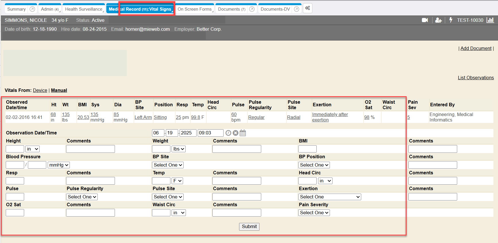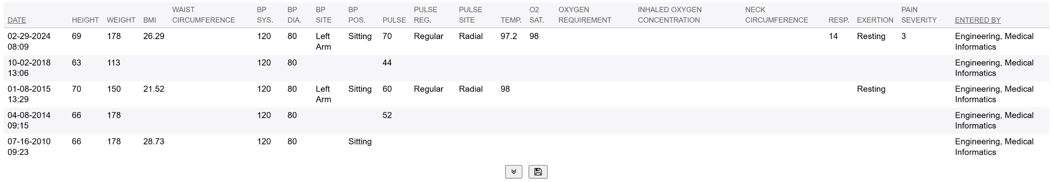 Click the SUBMIT button to save the set of vitals data.