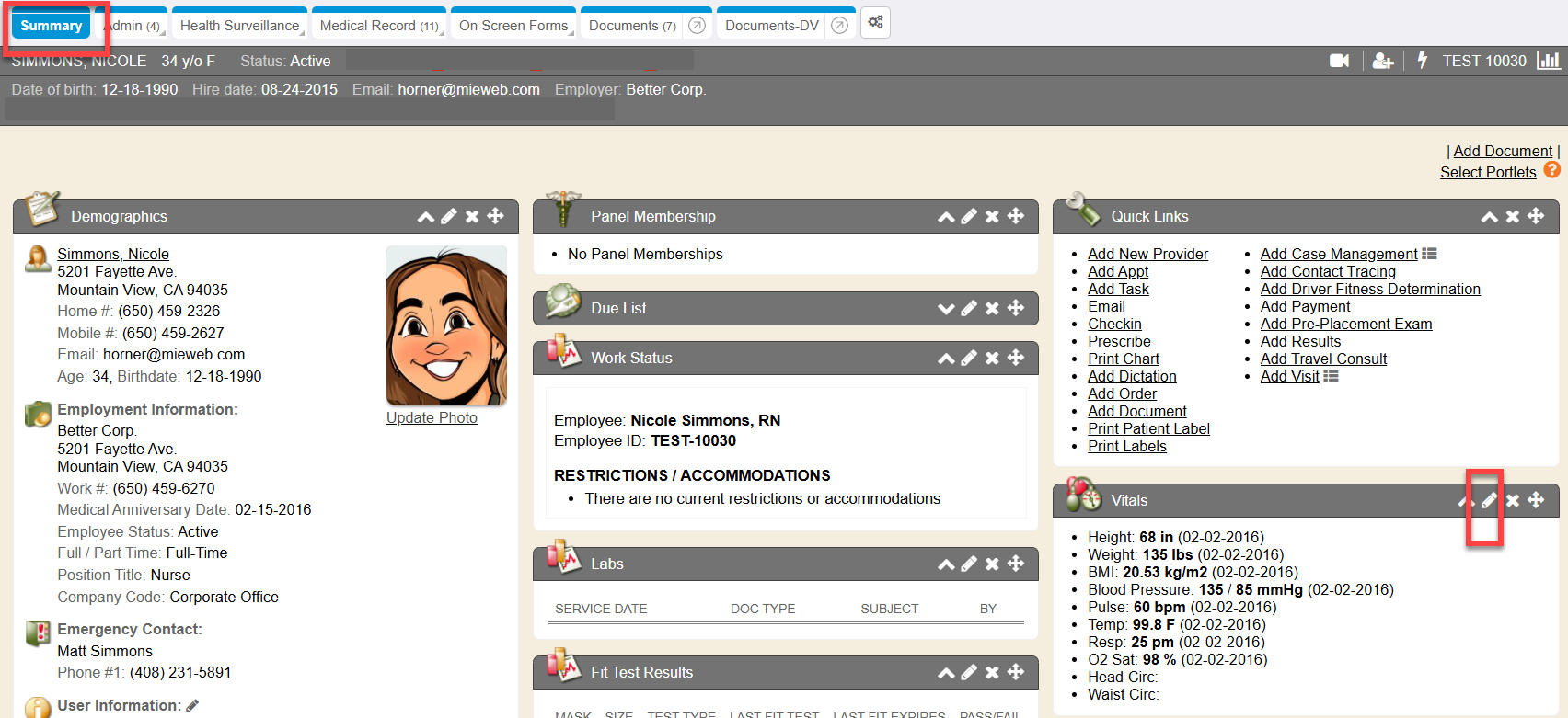 To add vitals to a chart without being in an encounter, utilize the pencil icon from the Vital Signs portlet found within the Summary dashboard chart tab.