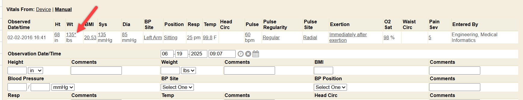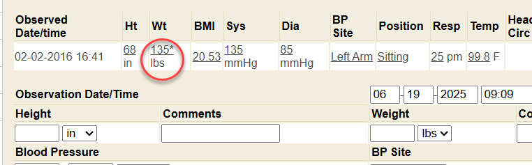 Vital signs store as individual observations in the chart and system. If you need to edit an existing, recorded vital, click on the specific recorded value you wish to edit or alter. Currently, editing or deleting vitals is done individually. In this example, we will click on the weight value recorded on 2/2/2016.