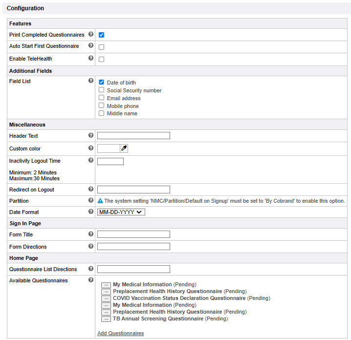 - Auto Start First Questionnaire: When enabled, this will automatically trigger the first available questionnaire after login. NOTE: This only applies to the first time viewing the home page.