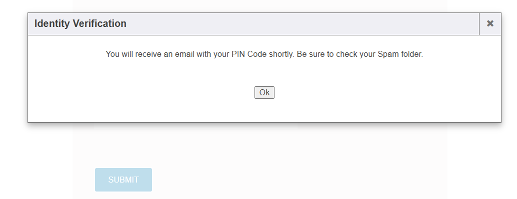 Once a selection has been made (typically to email the code), the pop-up window will state the PIN Code has been sent. Click OK to get out of that pop-up window.