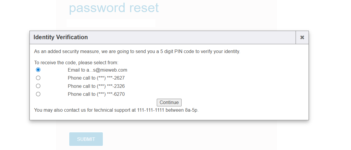 Back on the password reset screen, the Identity Verification pop-up window will appear. This is where the user can select the appropriate radio button as to how to receive the unique PIN code that will be sent to allow them to reset their password. Typically, only the email radio button option will appear for the PIN code to be sent to, however depending on how your system is set up to utilize other functions such as SMS or Phone Calls (and depending on what demographic data the chart contains), there may be other radio button options that appear.