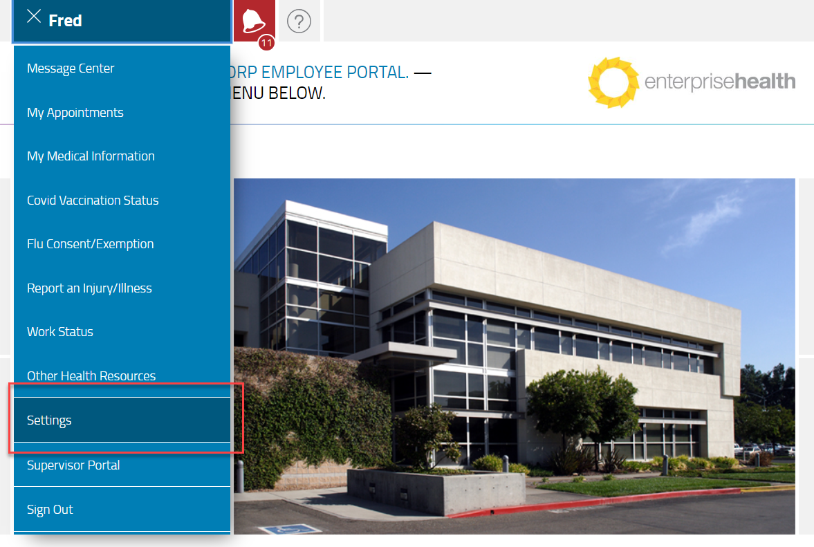 When the user is successfully logged into the portal, click on the SETTINGS sidemenu item.