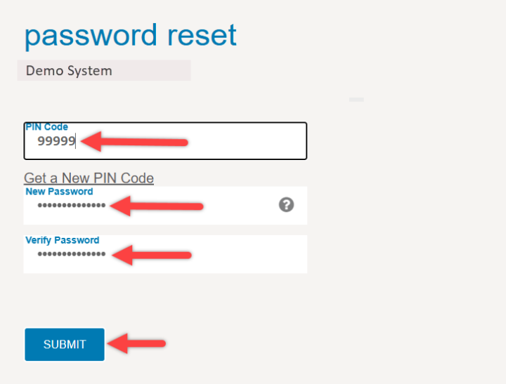 Back on the password reset screen, key in the unique PIN Code received and then key in your new password in the new password field and again in the verify password field. Click SUBMIT.