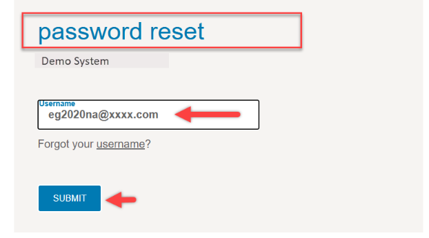 After the demographic validation, the user will be redirected to the password reset screen where the user has to key in their unique username once again (typically their email address) then click the SUBMIT button.