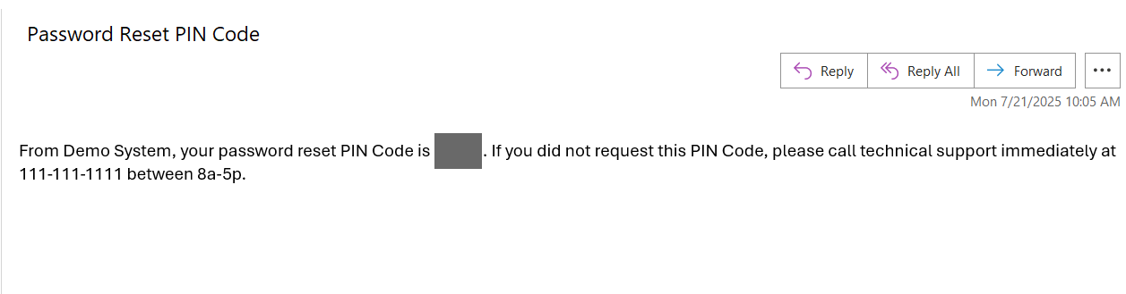 The PIN Code is sent according to the method selected. This is an example of the PIN Code being emailed and how the email will be received.