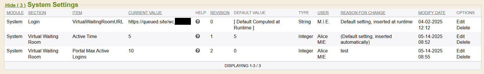 Three system settings are used to configure the virtual waiting room. The system virtual waiting room url, Active Time and Portal Max Active Logings.