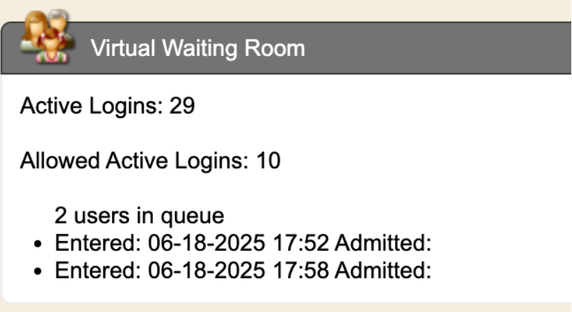 The Virtual Waiting Room Portlet can be turned on to view additional information regarding logins and users in the queue.