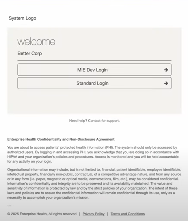 Once the user is allowed to login, the page will refresh and the user may now select their portal and log in (for SSO) or login in with login/password credentials (for non-SSO). If the user does not login (claim their login token in the waiting room queue) within the time defined in the “Active Time” system setting, then that user will lose their place in the queue (lose their login in token) and the next user in the queue will be allowed to log in.