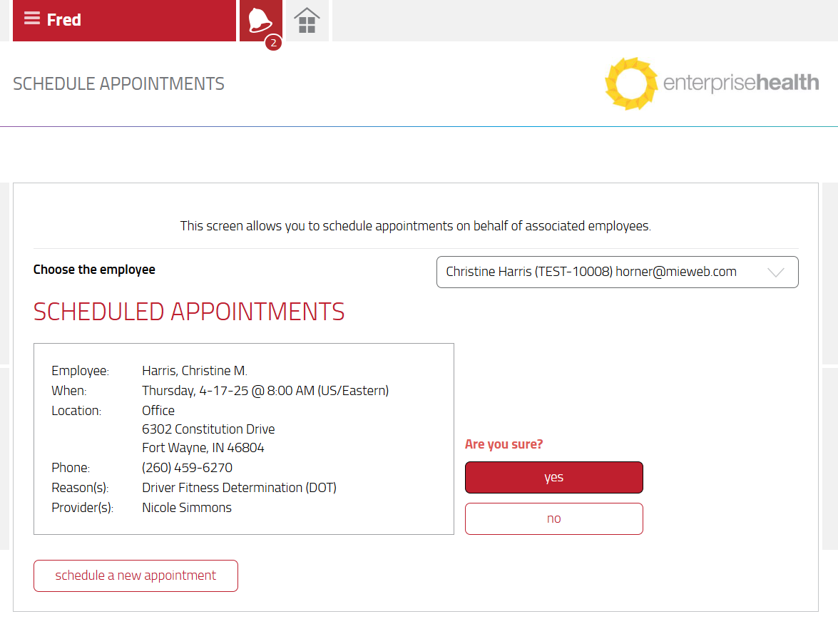 Enterprise Health will ask the supervisor Are you sure? That you want to cancel the appointment. Select the Yes button to cancel the appointment. Select the No button to keep the scheduled appointment.