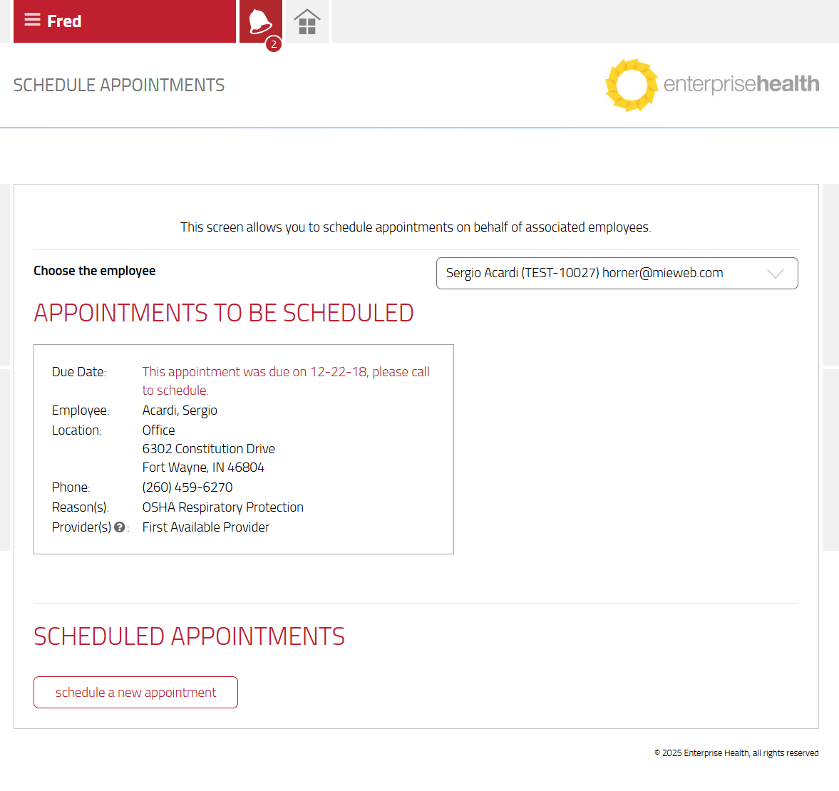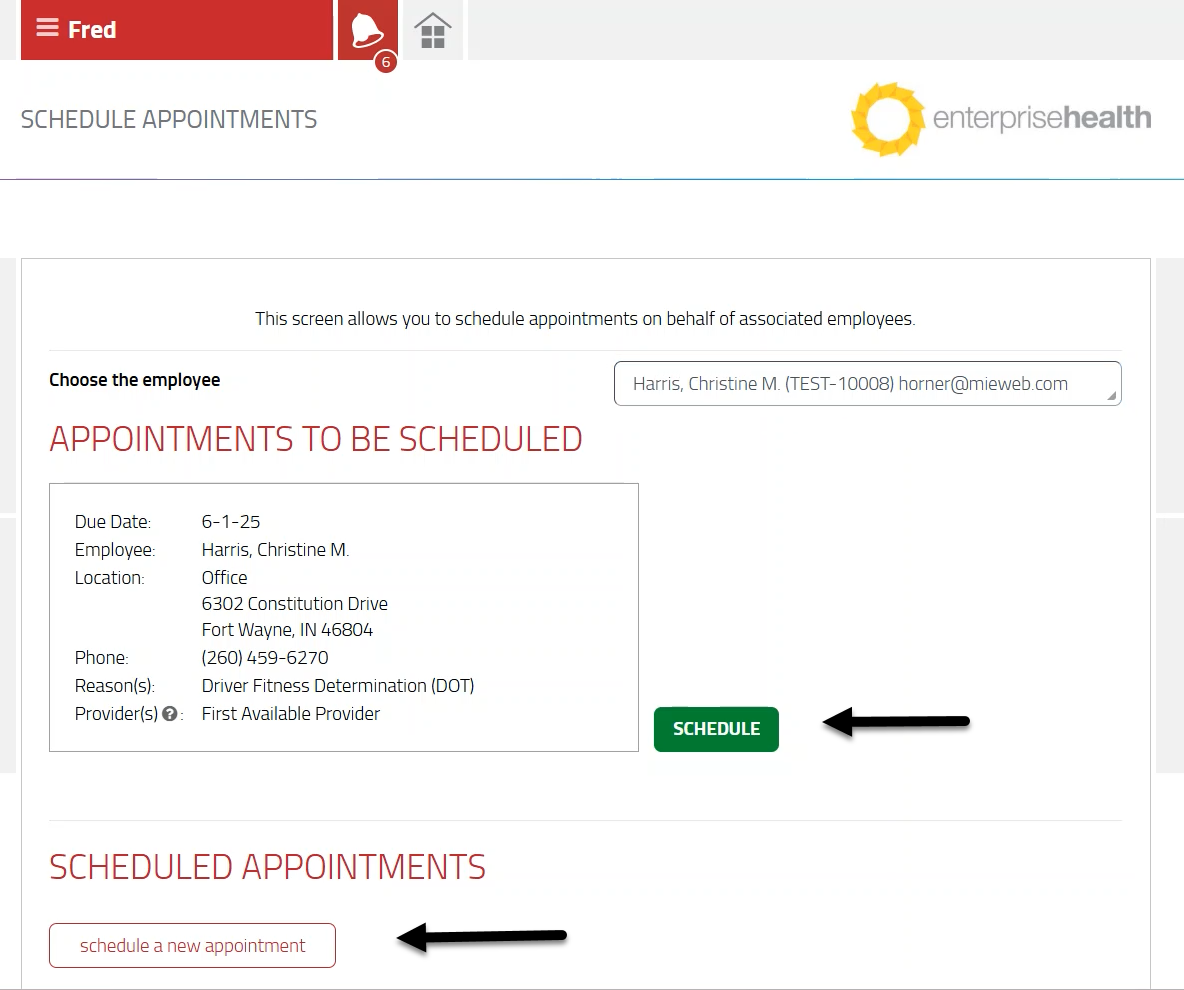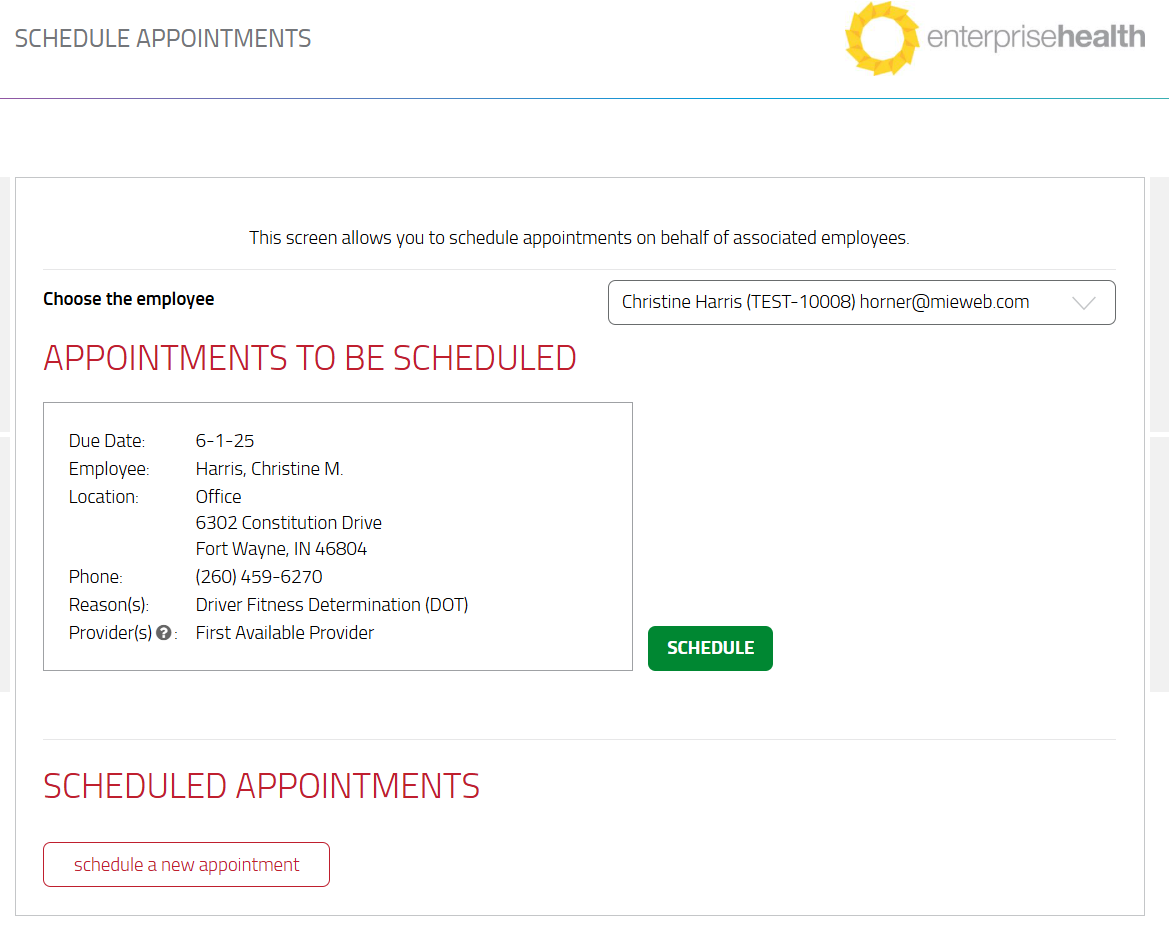 - Select the green Schedule button to schedule the employee for an appointment that is on the waiting list. Appointments To Be Scheduled, are typically waiting list appointments that have been automatically generated as a result of a surveillance program. This section will only display if a waiting list appointment exists. Otherwise, select the schedule a new appointment button to schedule an appointment on demand.