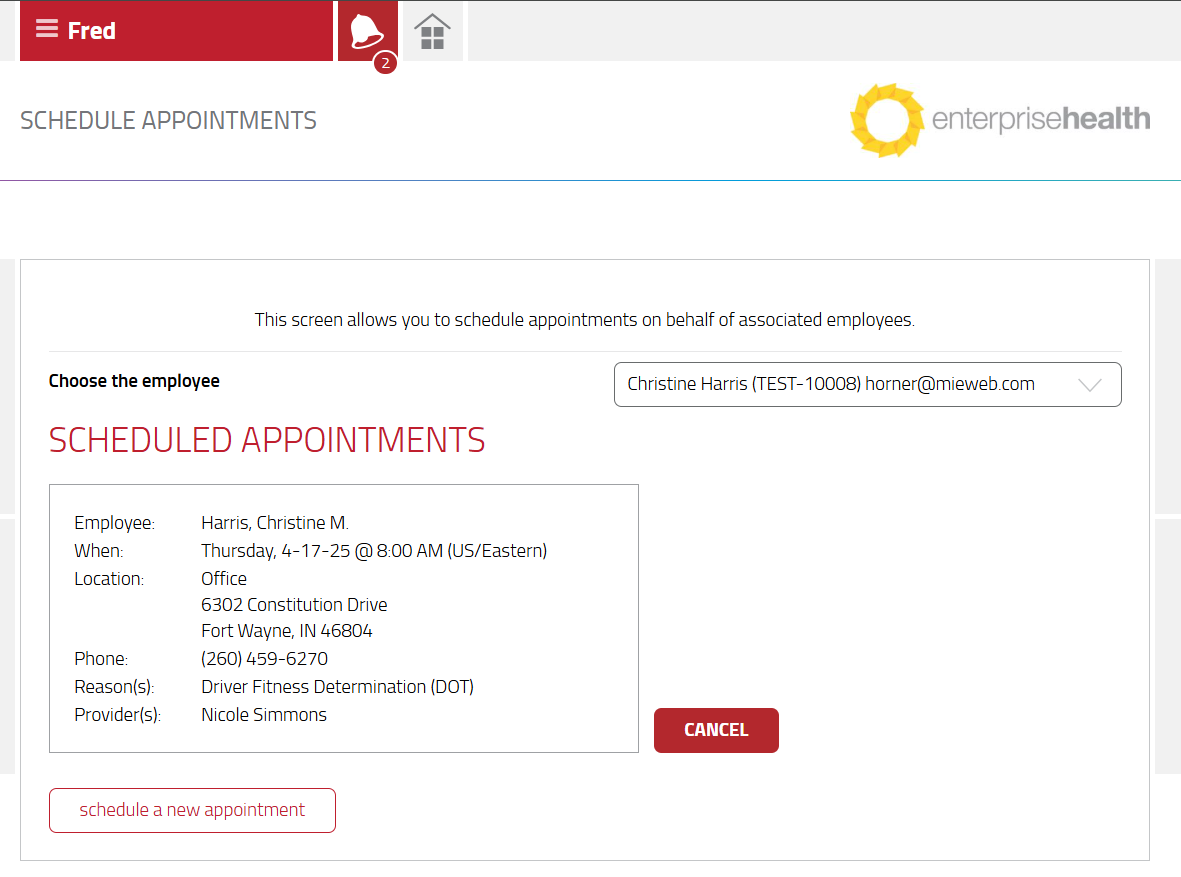 - Select the employee from the Choose the employee field to view scheduled appointments. Select the Red Cancel button next to the appointment to be canceled.